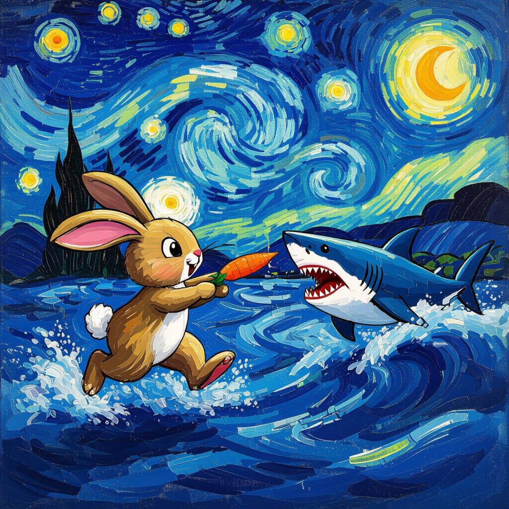 This image depicts a 16-bit bunny fleeing a shark on a swirling blue sea, rendered with thick, visible brushstrokes and vibrant colors in an expressive, impasto style.