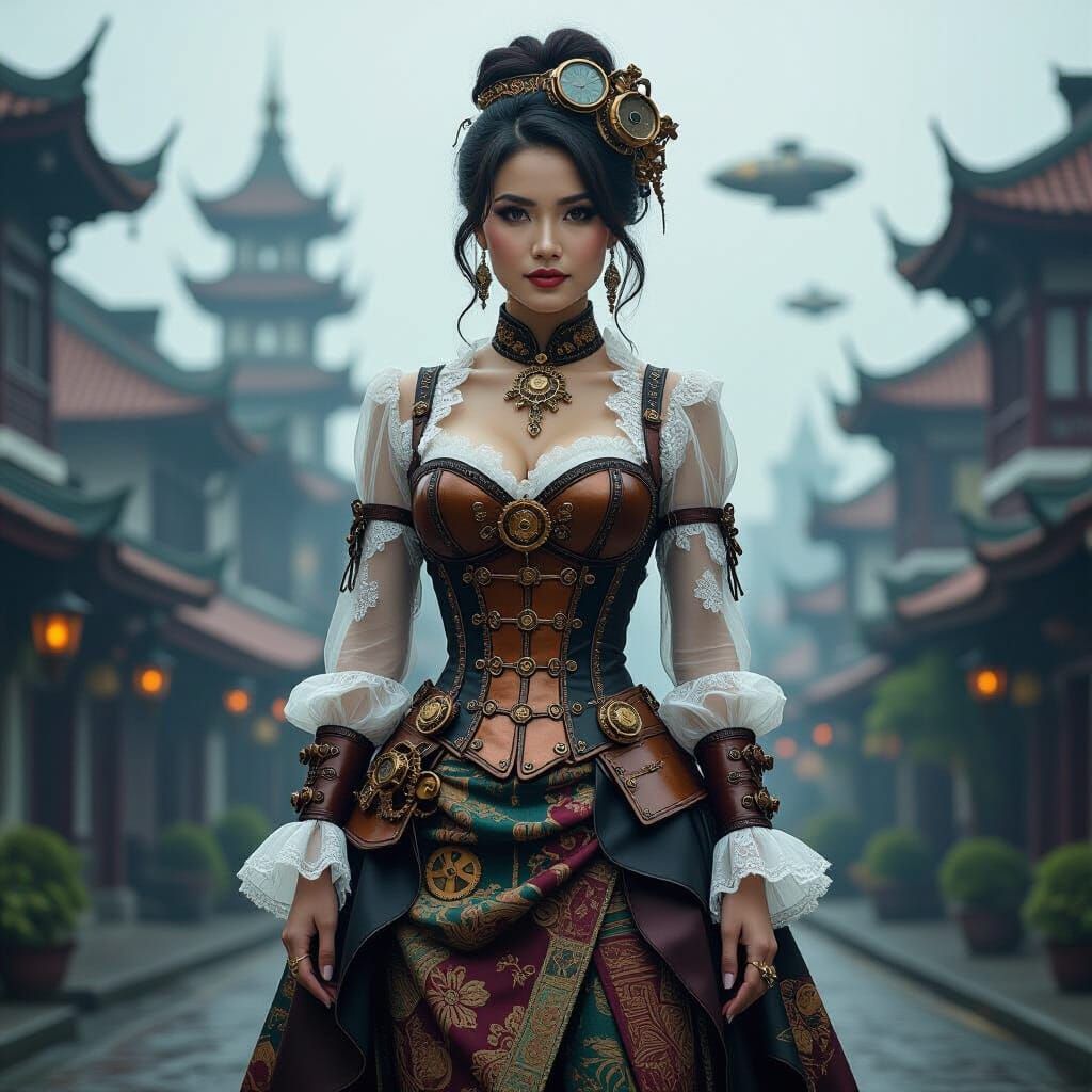 This image shows an Indonesian woman in a steampunk-inspired kebaya. The design blends Javanese tradition with Victorian mechanical elements, set against a retro-futuristic cityscape with cinematic lighting.