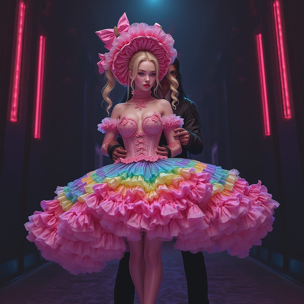 This image showcases a curvaceous woman in a stunning, frilly ballerina dress, surrounded by dark, modern elements and adorned with intricate lace and bows. The scene exudes a sense of power and intimidation.