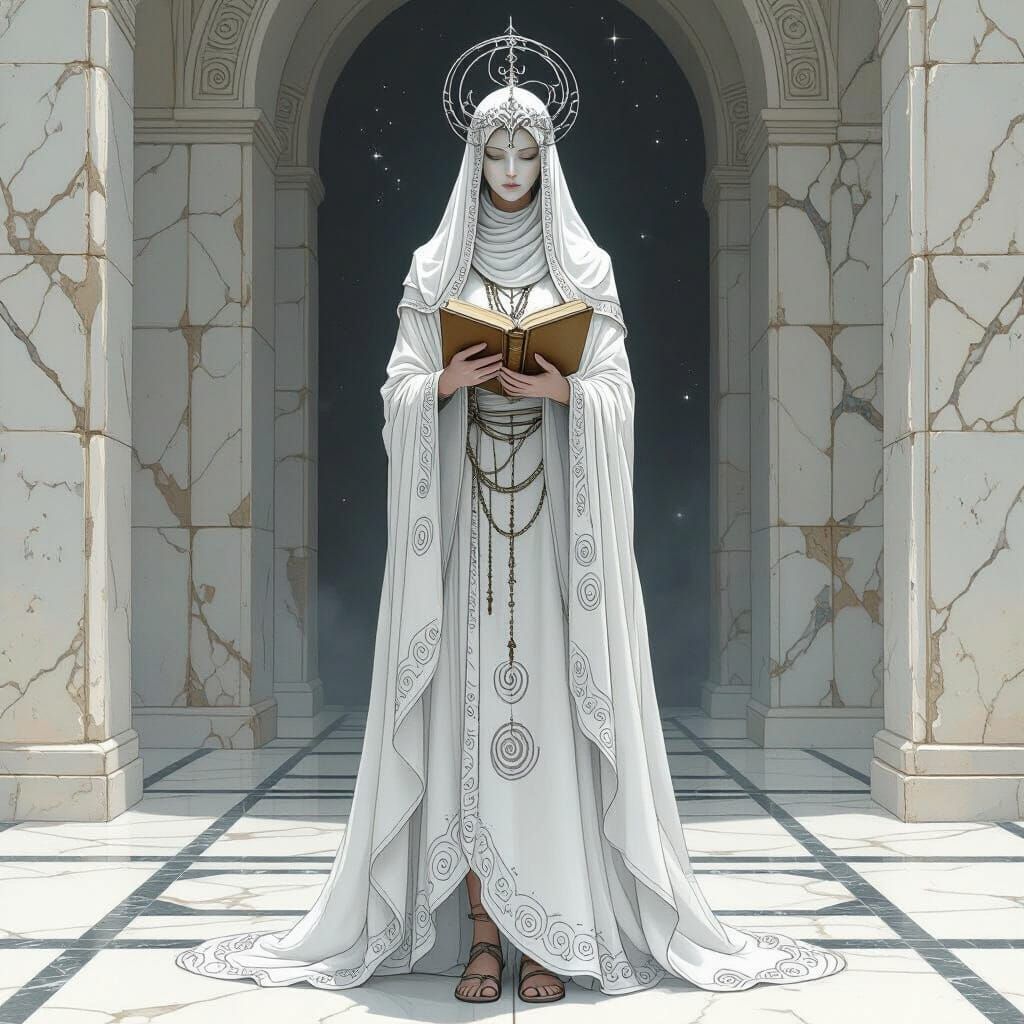 A tall, solemn woman in flowing white and silver robes stands in a perfectly symmetrical stone hall. Rendered in dark fantasy watercolour style with soft lighting.