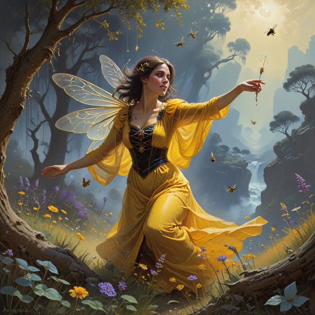 This image depicts a bee sorceress engaged in spellcasting, rendered in a vintage fantasy illustration style reminiscent of classic oil paintings.