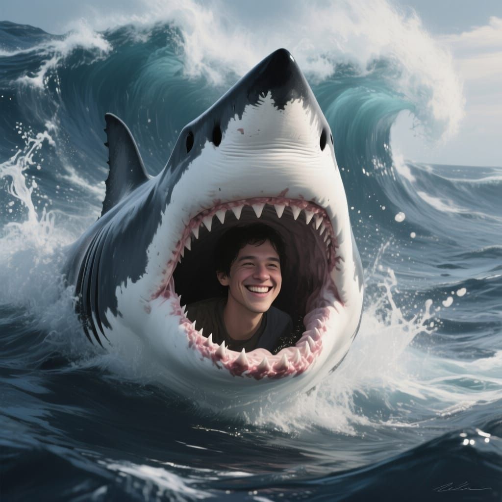 In the middle of the vast ocean I am under the stormy, with big wave action water, I am stretching open a great whites enormous jaws and ins...