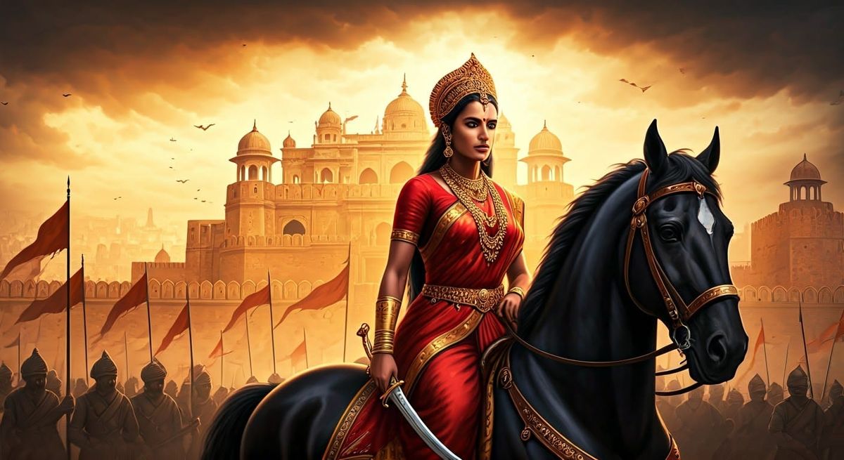 A striking picture of an Indian queen on horseback in warrior attire. The digital artwork features a dramatic sky, sepia-toned soldiers and volumetric lighting in hyperdetailed triadic colors.