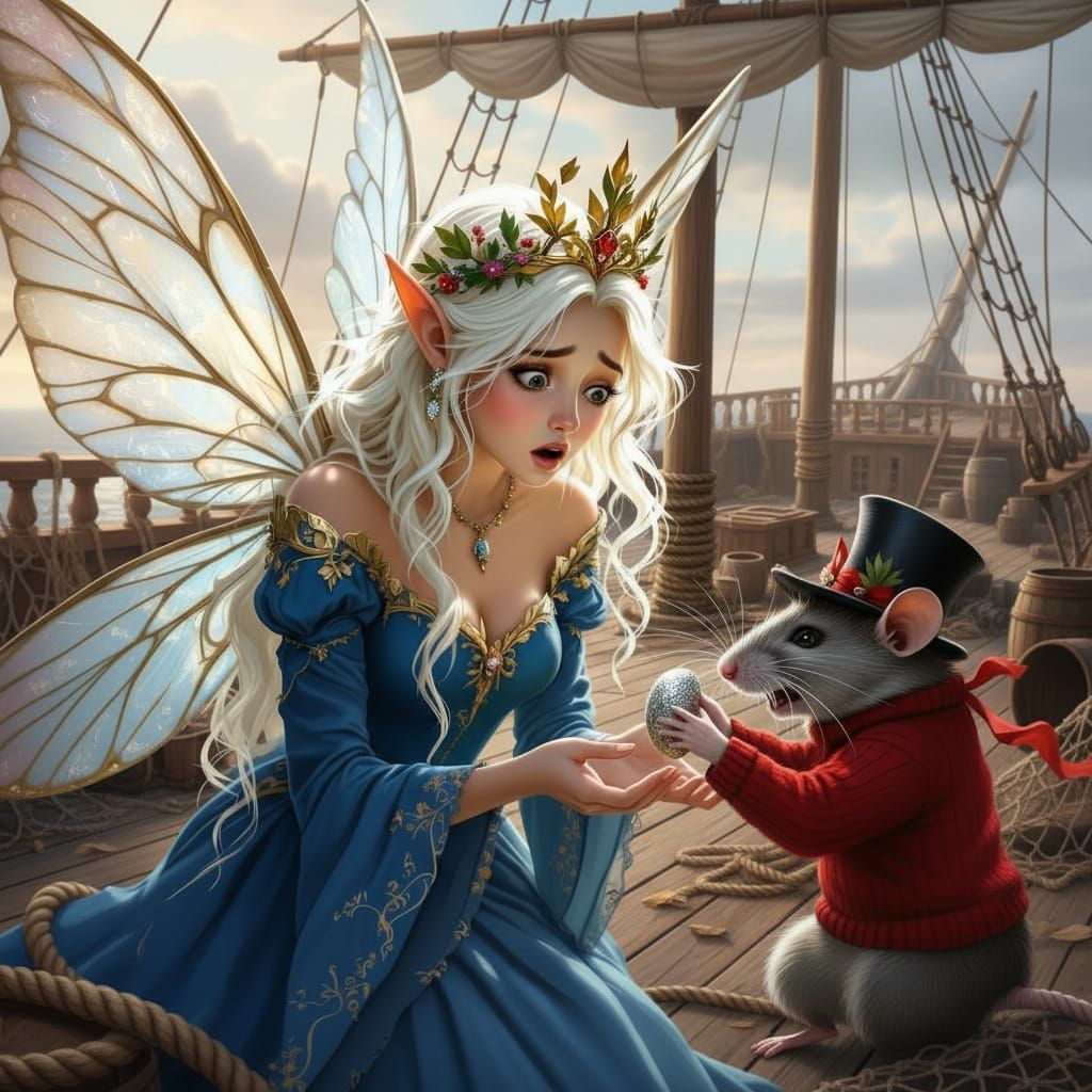 This image depicts a tall fairy with silver and gold wings and a blue dress, being escaped by a rat in a red sweater holding a stolen seed.