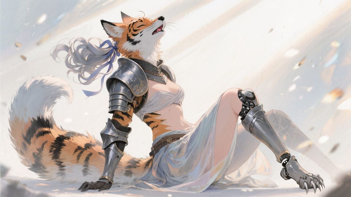 This image shows a beautiful, exhausted anthropomorphic fox with tiger stripes in knight armor. The digital art is styled as a high fantasy anime graphic novel with soft lighting and bokeh effects.