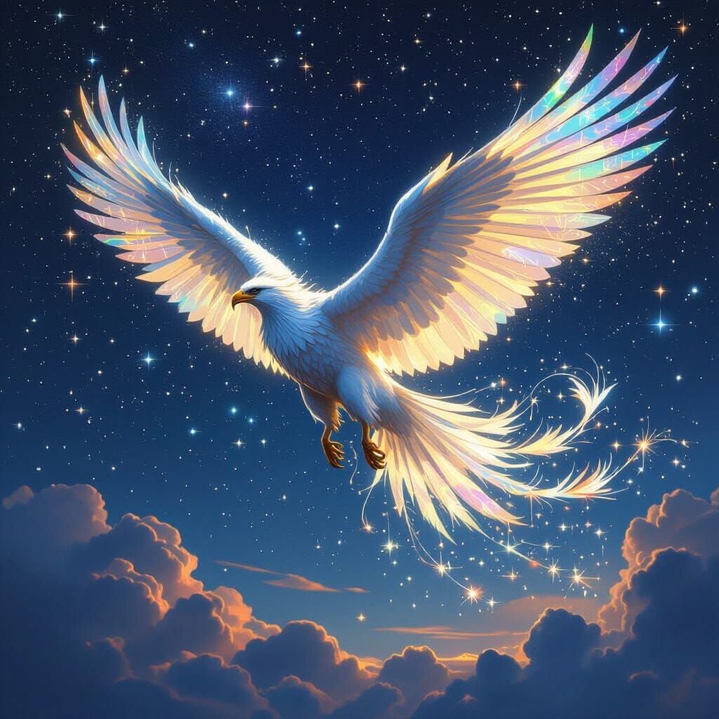 A majestic griffin soars through a starlit sky, its feathers shimmering with holographic projections of constellations. The wind whispers secrets through its wings as it navigates the celestial currents. Volume and depth lighting accentuate the scene, with sparkling stardust trailing behind the mythical ...