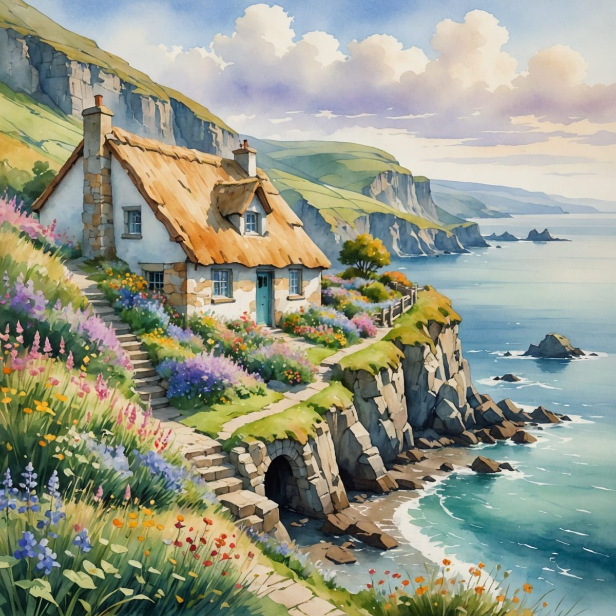 A watercolor painting of a cottage on the Scottish coast. The artwork features stone walls, thatched roofs, and wildflowers overlooking the sea, rendered with delicate brushstrokes and pastel colors in a Rococo style.