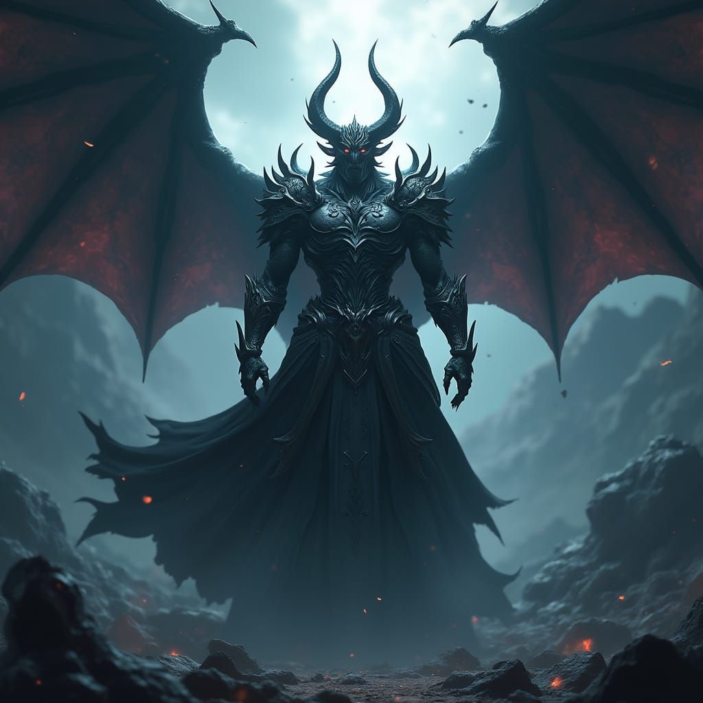 A striking picture of a demonic god in elaborate dark armor with horns and wings. The god stands in swirling shadows, rendered as detailed 3D anime art with breathtaking textures.