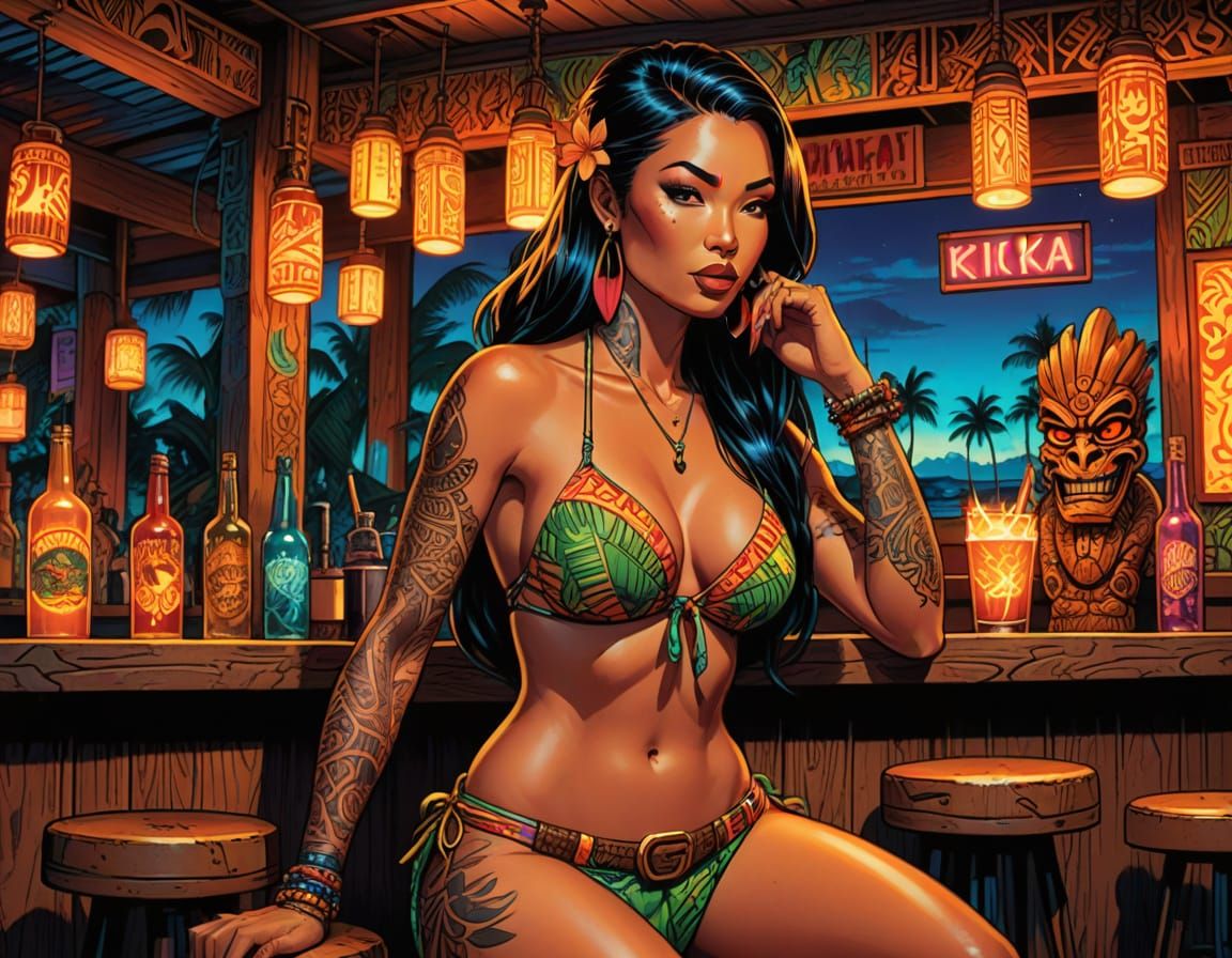 A medium shot depicts a Hawaiian beauty with full-body Yakuza tattoos in a tiki bar. The comic book art features vibrant colors, bold lines, neon lights, and soft shadows.