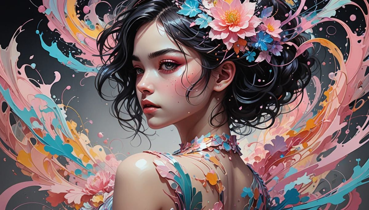 This image shows a dynamic, full-body anime-style painting of a young Arab woman with intricate details, featuring gold lines against granite and fractal elements.
