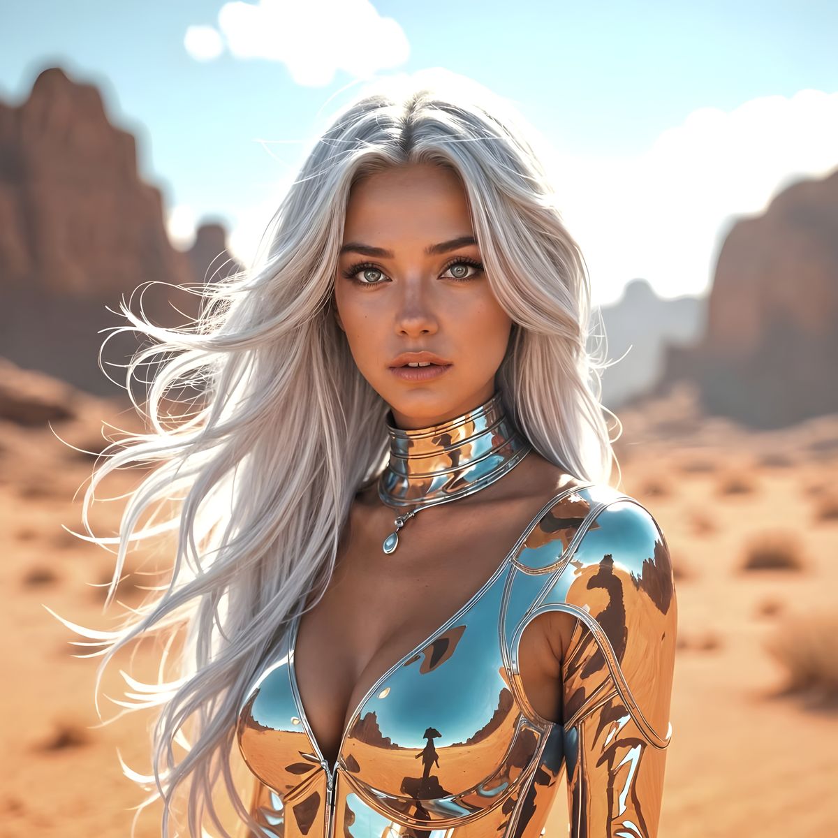 A surreal image of a woman with liquid mercury hair in a desolate desert. The scene uses soft, ethereal lighting, intricate details and a dreamlike quality to create an otherworldly atmosphere.