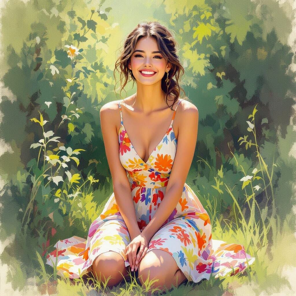 This image captures a woman in a sundress on her knees, radiating happiness amidst lush greenery. The artwork features soft brushstrokes and warm colors, evoking an Impressionist aesthetic.