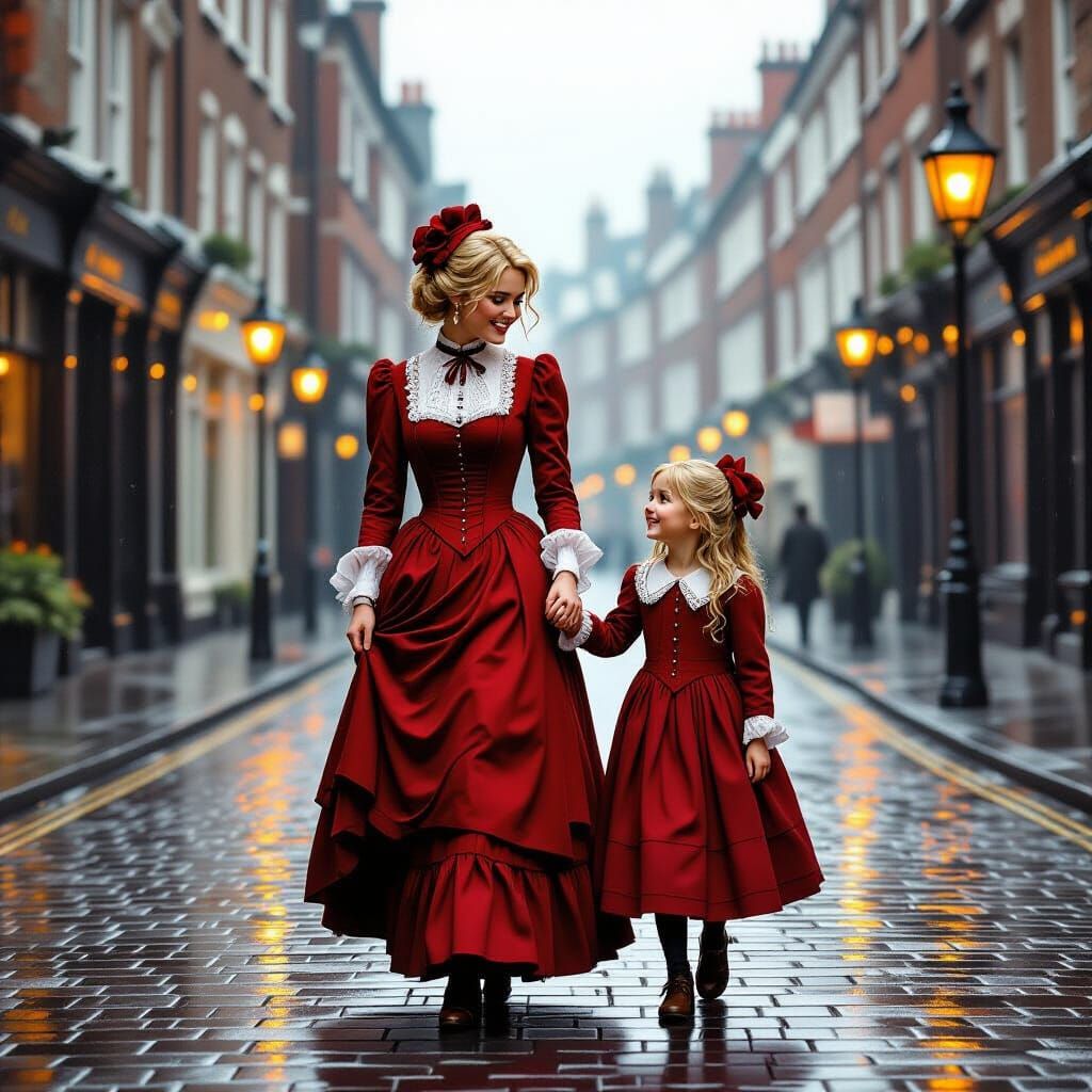 A mother and daughter in Victorian dress smile while crossing a rainy London street. The scene is depicted in a romantic, painterly style with soft textures and emotional focus.