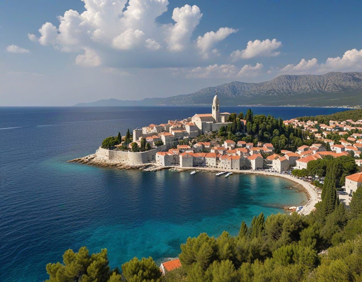 This image showcases the beautiful coastal town of Korčula, situated along the sparkling Adriatic Sea in Croatia. A picturesque view of the Croatian coastline.