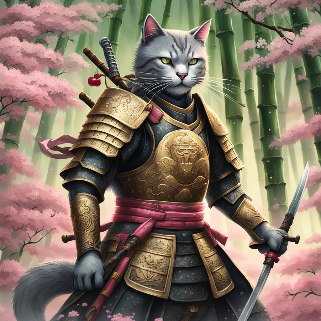 A striking picture of a cat in samurai armor, posed dynamically with a katana. The artwork features intricate details, a misty bamboo forest, and a vibrant color palette in a fauvist expressionist style.