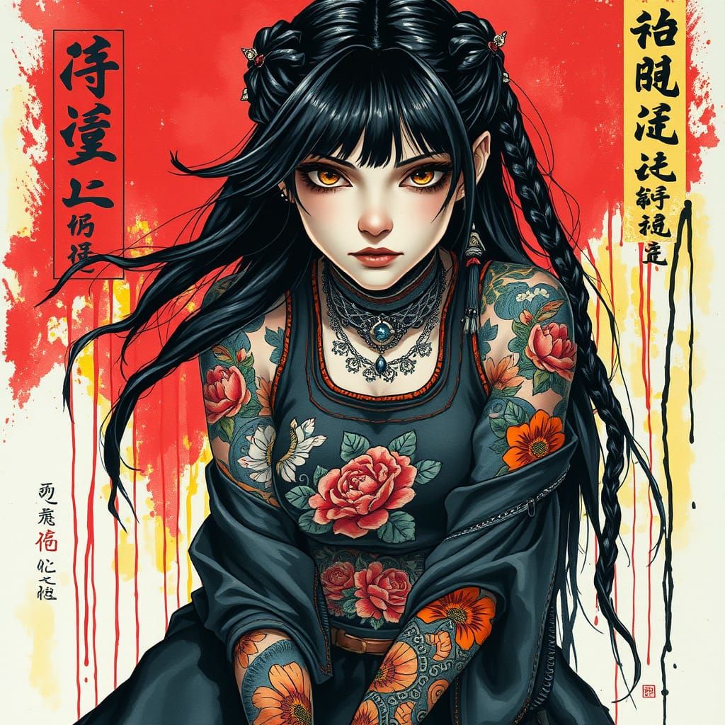 This image shows a mysterious Steampunk girl with intricate details and bold brushstrokes, set against a textured red and yellow backdrop with Eastern script elements.