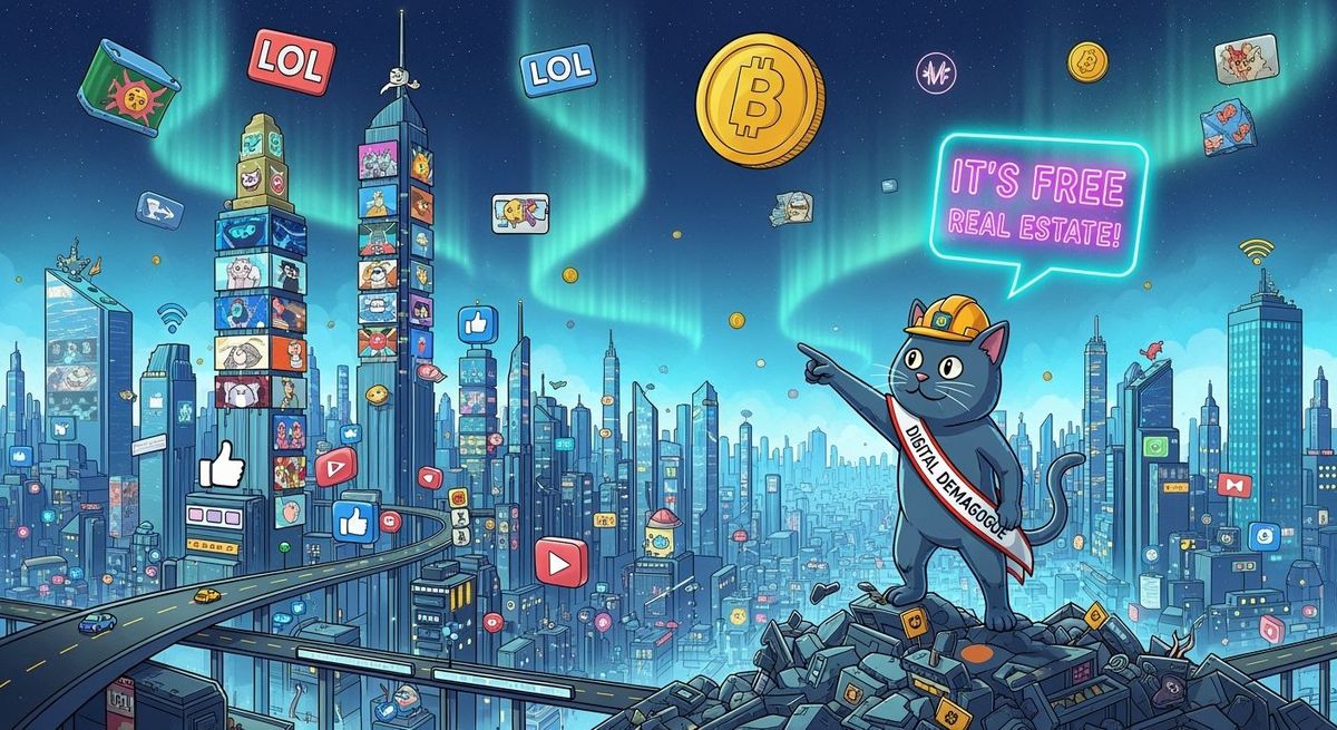 A chaotic cityscape constructed of internet memes and data streams shows a cat wearing a hardhat and sash standing atop a mountain of discarded internet clout. The digital art style is cartoon-inspired and satirical.