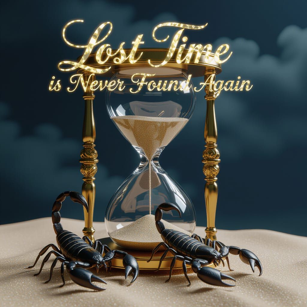 This image shows an ornate hourglass with a gold frame and baroque details. Two scorpions are trapped inside, surrounded by sand. Shimmering gold text floats above, all set against a dark, cinematic backdrop.