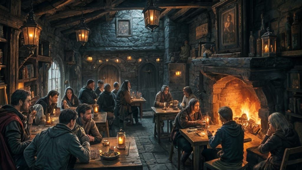 This image captures a lively medieval tavern interior, complete with adventurers and travelers. The scene is rendered in a dark fantasy art style with atmospheric lighting, featuring a warm fireplace and detailed wooden furnishings.