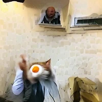 This image shows a Turkish man shouting 'meow' at an egg. The surreal image captures the bizarre interaction with a minimalist composition.