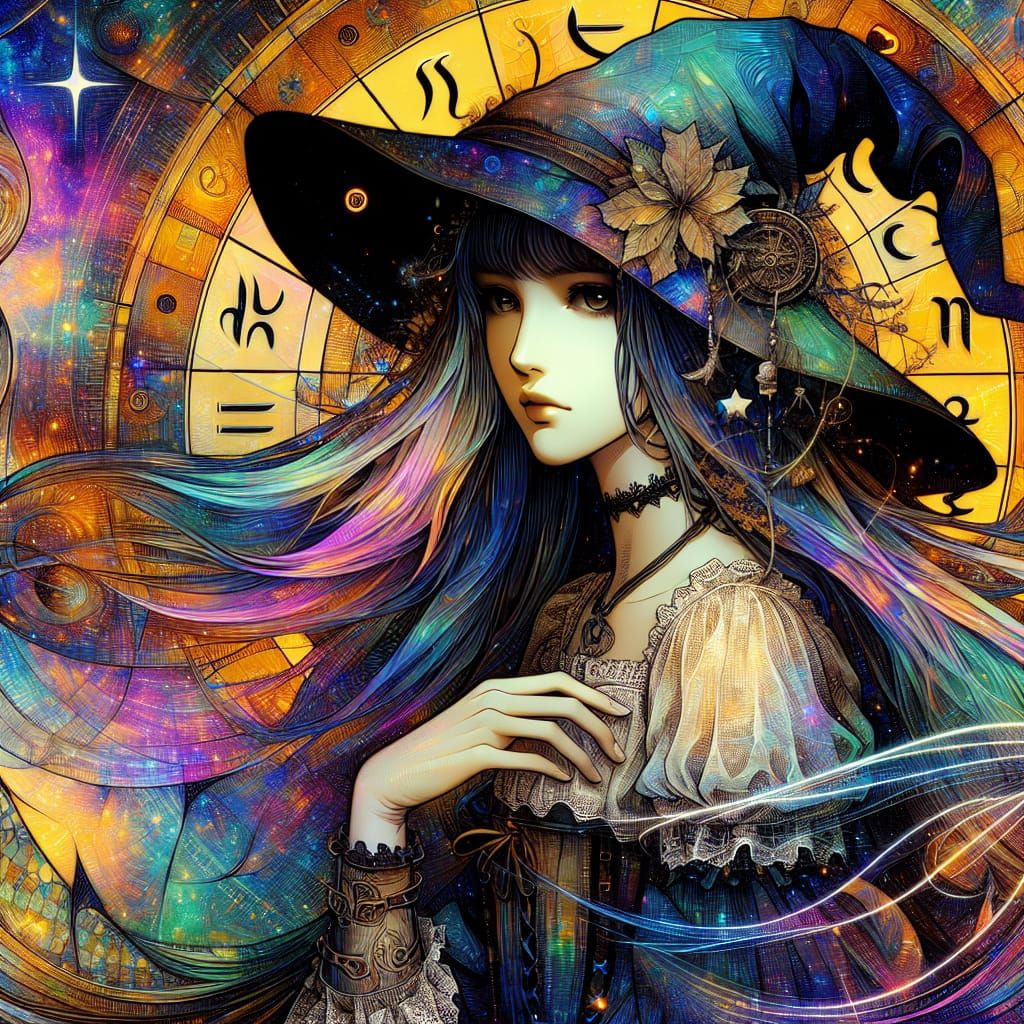 A striking picture of a witch-like figure blending Renaissance elegance with manga-style features, set against a vibrant psychedelic carnival backdrop with mystical moonlight. The image incorporates steampunk elements and astrological symbols.