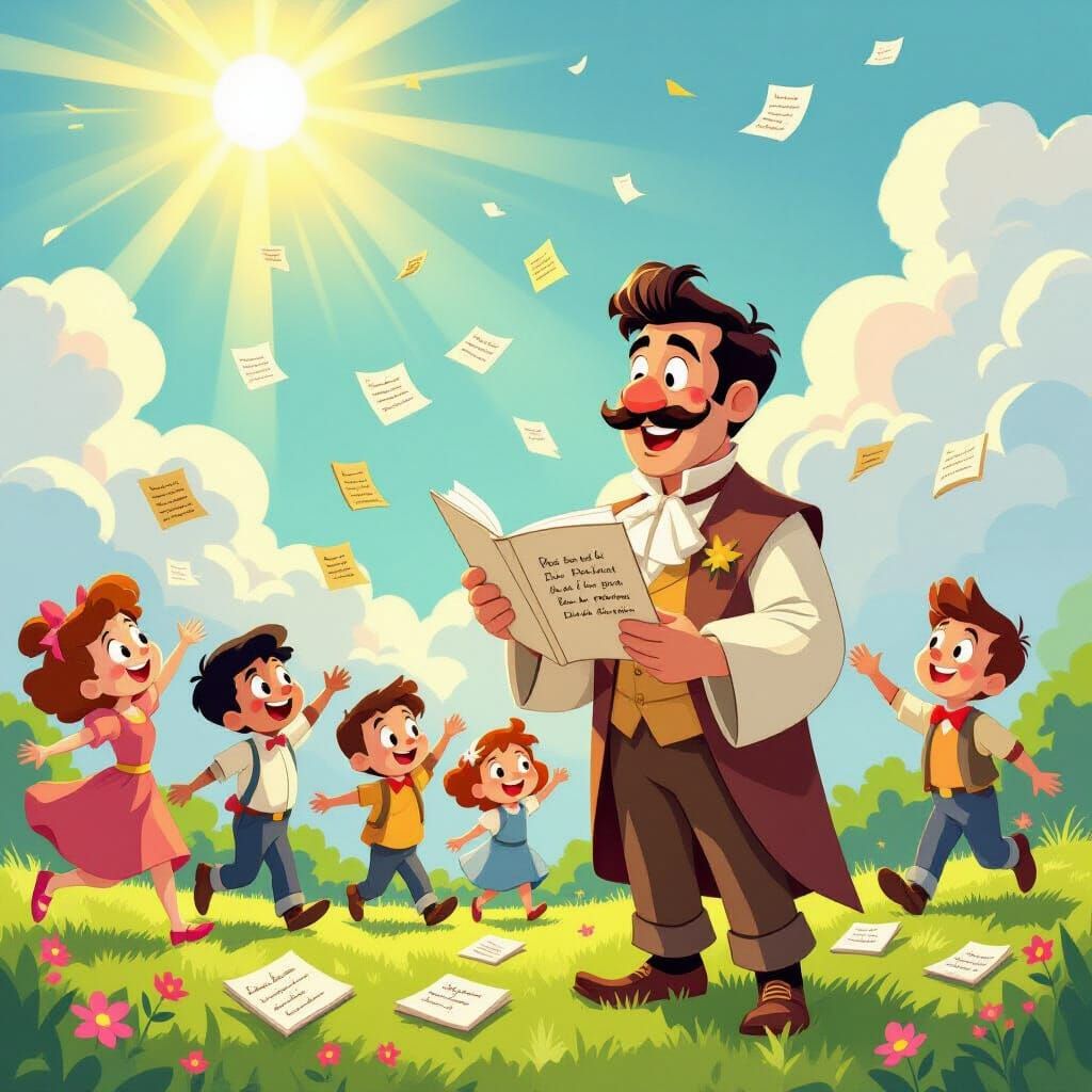 This image shows a poet in an elegant outfit reading his poems to joyful fans. The cartoon illustration, reminiscent of classic Disney animation, features vibrant colors and whimsical details in a Hayao Miyazaki style.
