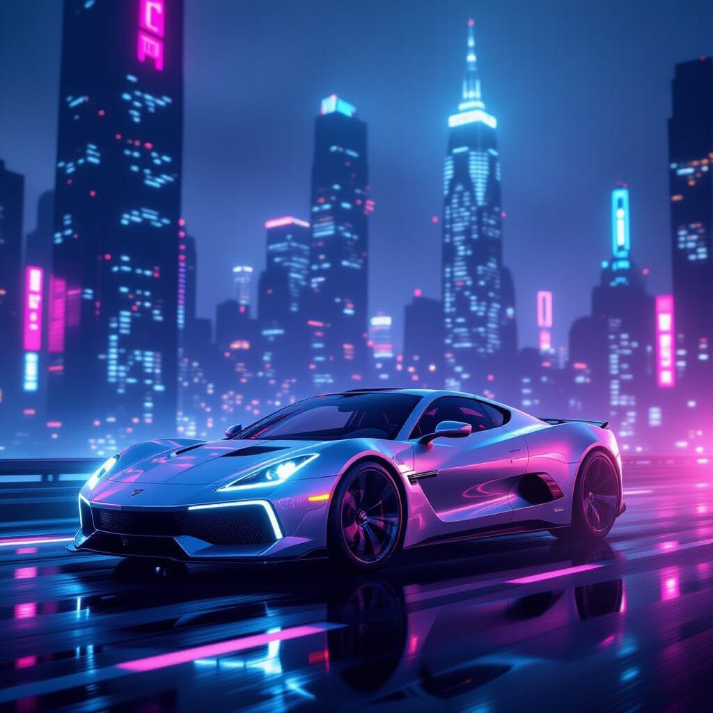 This image shows a detailed futuristic sports car in a neon cityscape, presented in a vintage travel poster style with cinematic lighting and vivid colors.