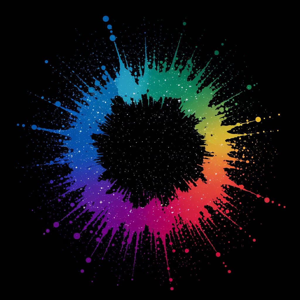 This image shows a hyperrealistic splash art piece of a paint spill against a black backdrop, creating the illusion of a starry night sky with vibrant colors and intricate details.