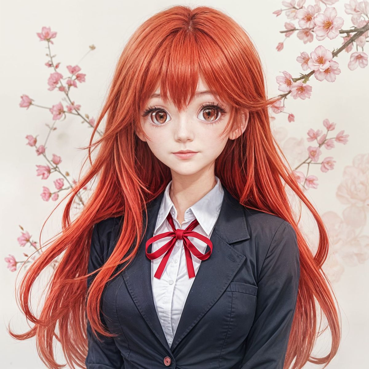 This image shows an anime-style girl with flowing red hair and striking rose-colored eyes. The portrait captures the essence of anime aesthetics in a vibrant and captivating style.
