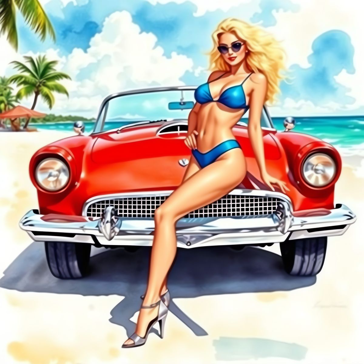 A vivid image of a blonde woman in a blue bikini and high heels striking a pose in front of a red 1956 Thunderbird on a tropical beach. The scene is rendered in a vibrant watercolor style.