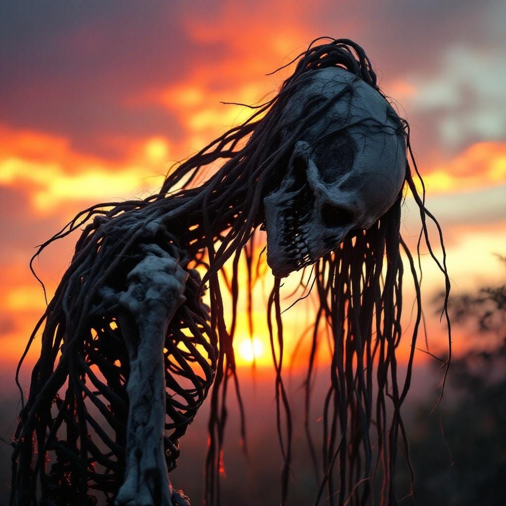 This image shows a tall, skeletal voodoo doll silhouetted against a colorful sunset. The image exhibits a cinematic and atmospheric quality with hyperrealistic details.