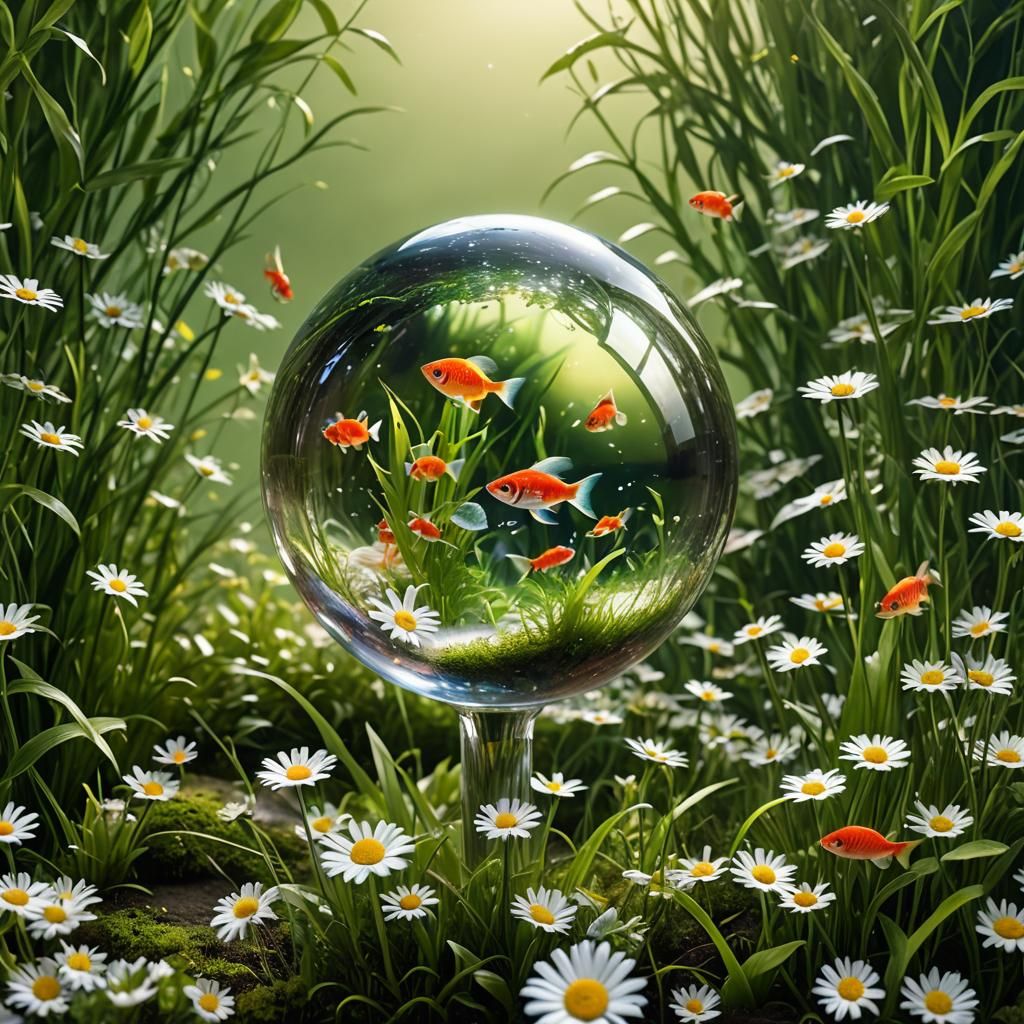 A captivating image of a glass ball reflecting light, revealing colorful aquarium fish in a balletic dance. The ball rests on brown earth amidst a lush green meadow filled with daisies, rendered as detailed matte painting.
