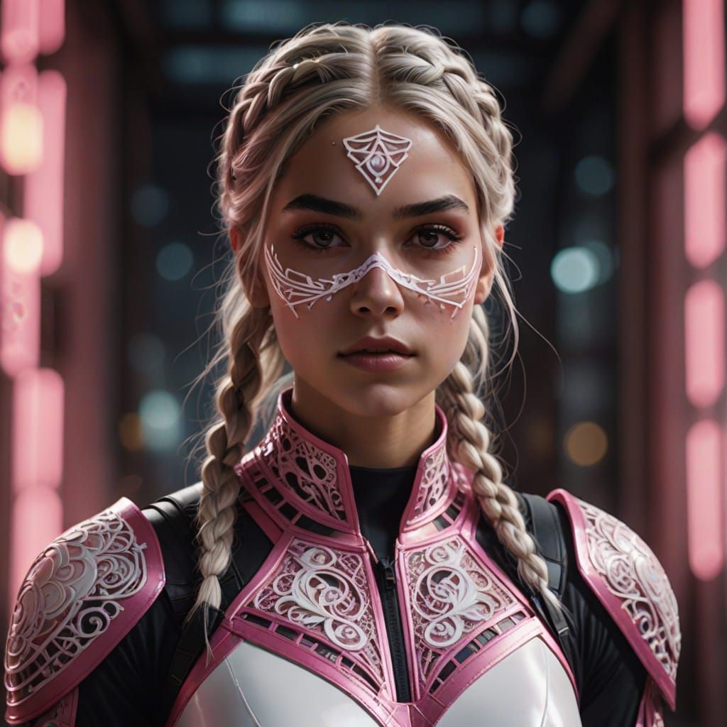 This hyperrealistic concept art shows a 17-year-old Spanish-American girl superhero with braided platinum hair and a pink and white costume. Cinematic lighting and dramatic shadows enhance the epic scene.
