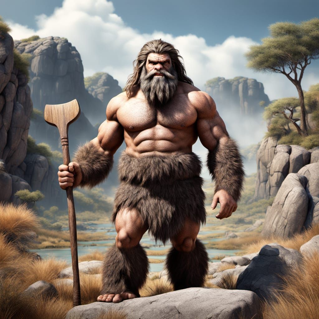 This image shows a muscular caveman with disheveled hair and a thick beard, clad in animal furs and gripping a wooden club. The backdrop features a rocky, prehistoric environment as 3d rendered digital art.