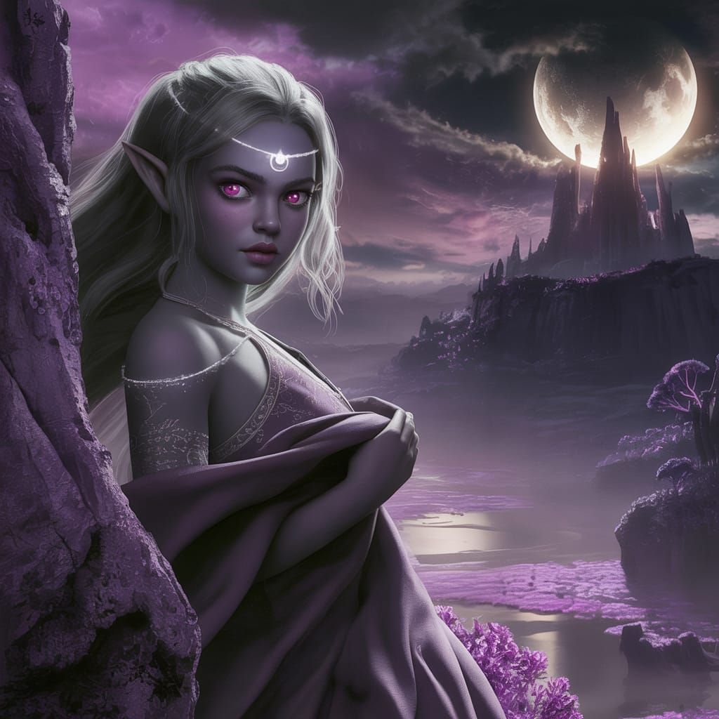 A striking elf with white hair and pink eyes stands on a purple cliff. This dark fantasy concept art features dramatic lighting and intricate details, evoking an otherworldly atmosphere.