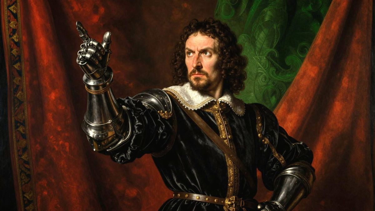 An oil painting in the style of Hans Holbein der Jüngere depicting Goetz von Berlichingen standing defiantly before an unseen Emperor. Goetz is gesturing emphatically, his face a mask of indignation and resolve. The background is a dark, richly textured tapestry. The scene is illuminated by the dramatic, ...