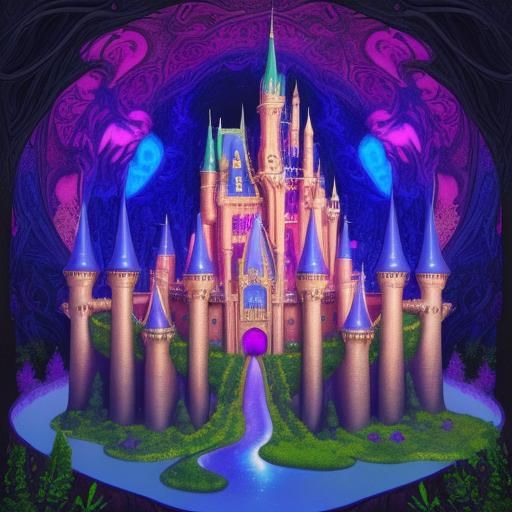 This image shows a psychedelic fantasy castle with vibrant colors and swirling patterns. The castle is set against a dreamlike background, creating a surreal and captivating scene.