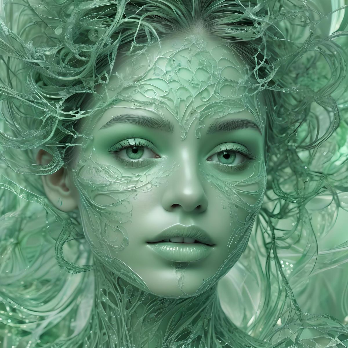 This image shows an abstract portrait of a green woman's face. The artwork features intricate lines and shading in a vector fractal style to create a visually striking design.