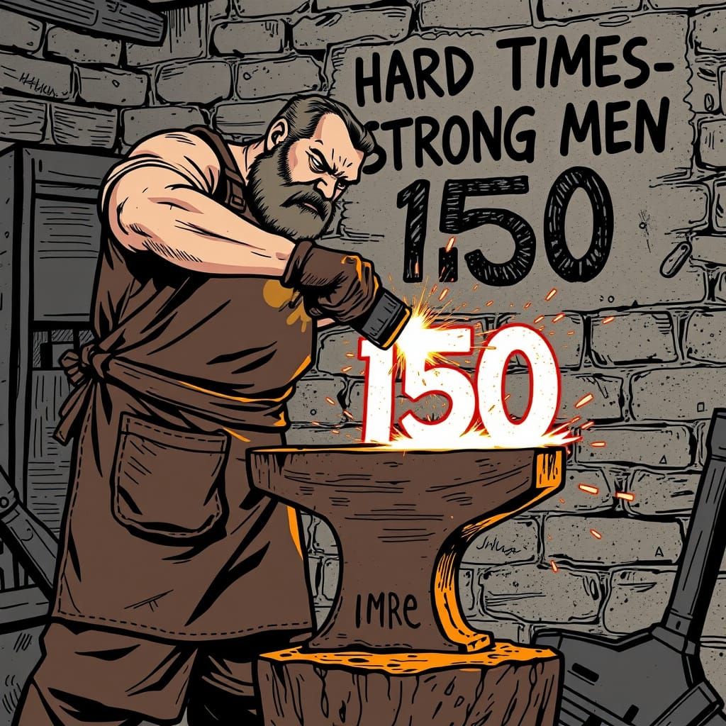 This image shows a blacksmith shaping a glowing metal piece on an anvil. The number '150' is being formed, with sparks flying in a gritty, urban setting reminiscent of 90s street art.