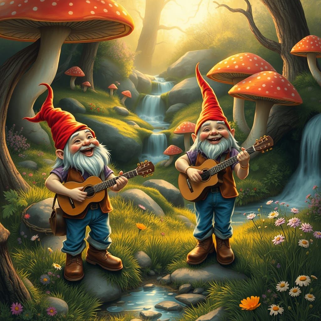 A group of gnomes strum guitars in a whimsical forest at sunrise. The scene features vibrant mushrooms, a gentle waterfall, and wildflowers, rendered with earthy details and golden lighting reminiscent of fairy tale art.