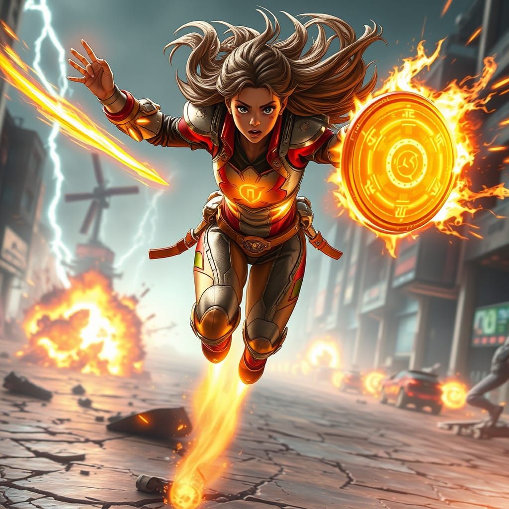A vivid image of a young Latina warrior launching into action. The scene depicts her in a futuristic battle suit amidst chaos, wielding energy and magic with fierce determination in a cyberpunk aesthetic.