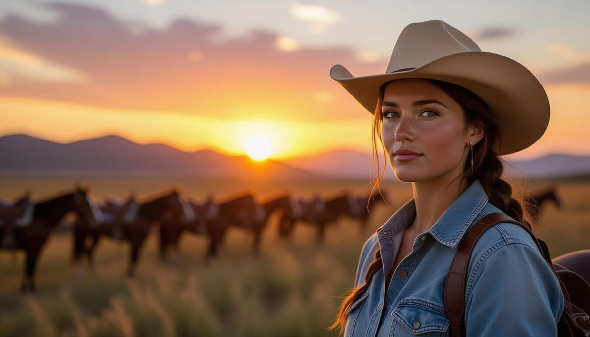 This image features a striking double exposure of a cowgirl with a weathered face and distinctive hat, alongside a herd of wild horses galloping at sunset over rugged mountains.