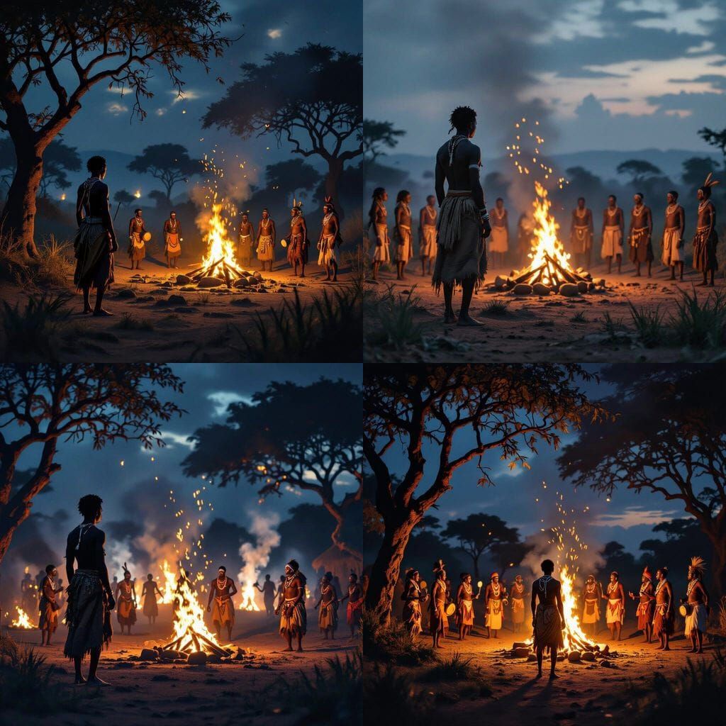 Generate your own unique images of African villages at night, featuring young men, sacred groves, and ritual fires. Free and easy to use!