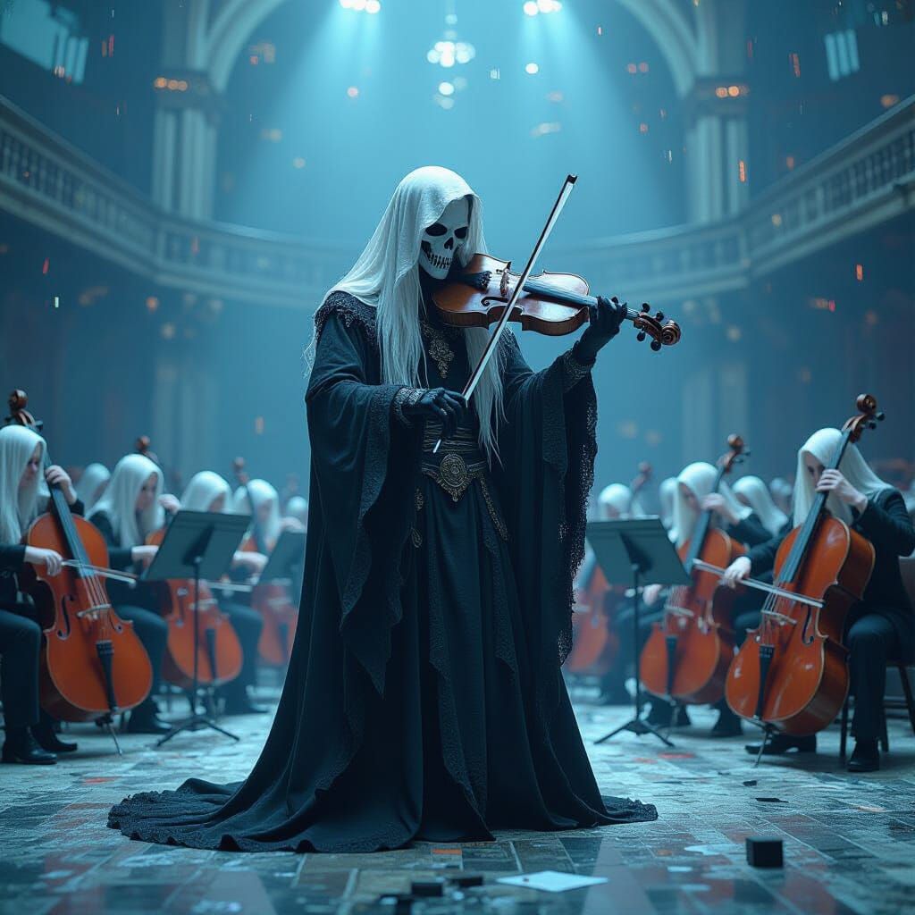 This image shows a digital Grim Reaper with white hair fading into binary code amidst a decaying concert hall. The artwork blends futuristic and mystical themes with pixelcore aesthetics.