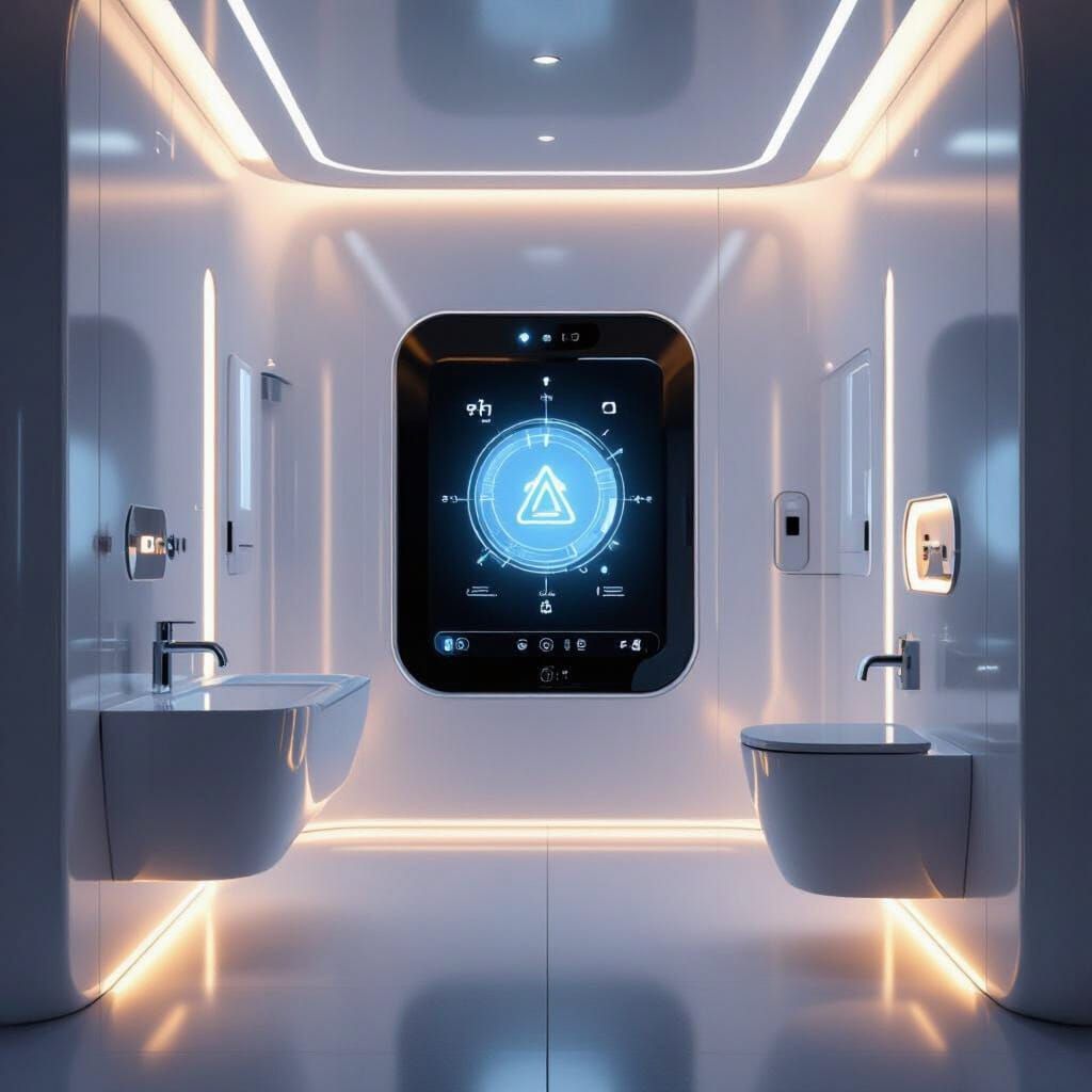 This image showcases a minimalist, futuristic self-cleaning bathroom. Integrated AI, smart sensors, and automated jets create a sterile, efficient space with ambient lighting and holographic displays.