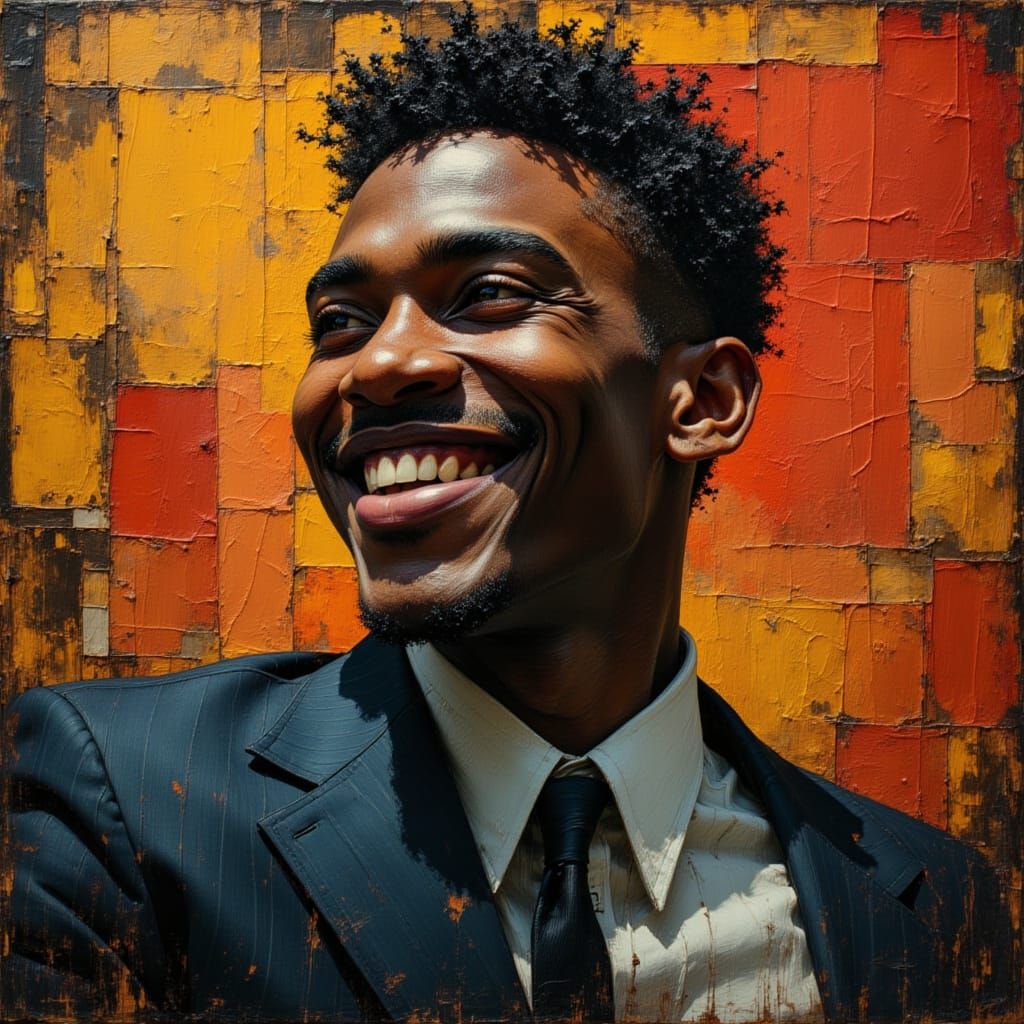 This hyperrealistic image features a handsome, smiling African God in a formal suit. Dramatic lighting and vibrant colors highlight divine oil painting textures.