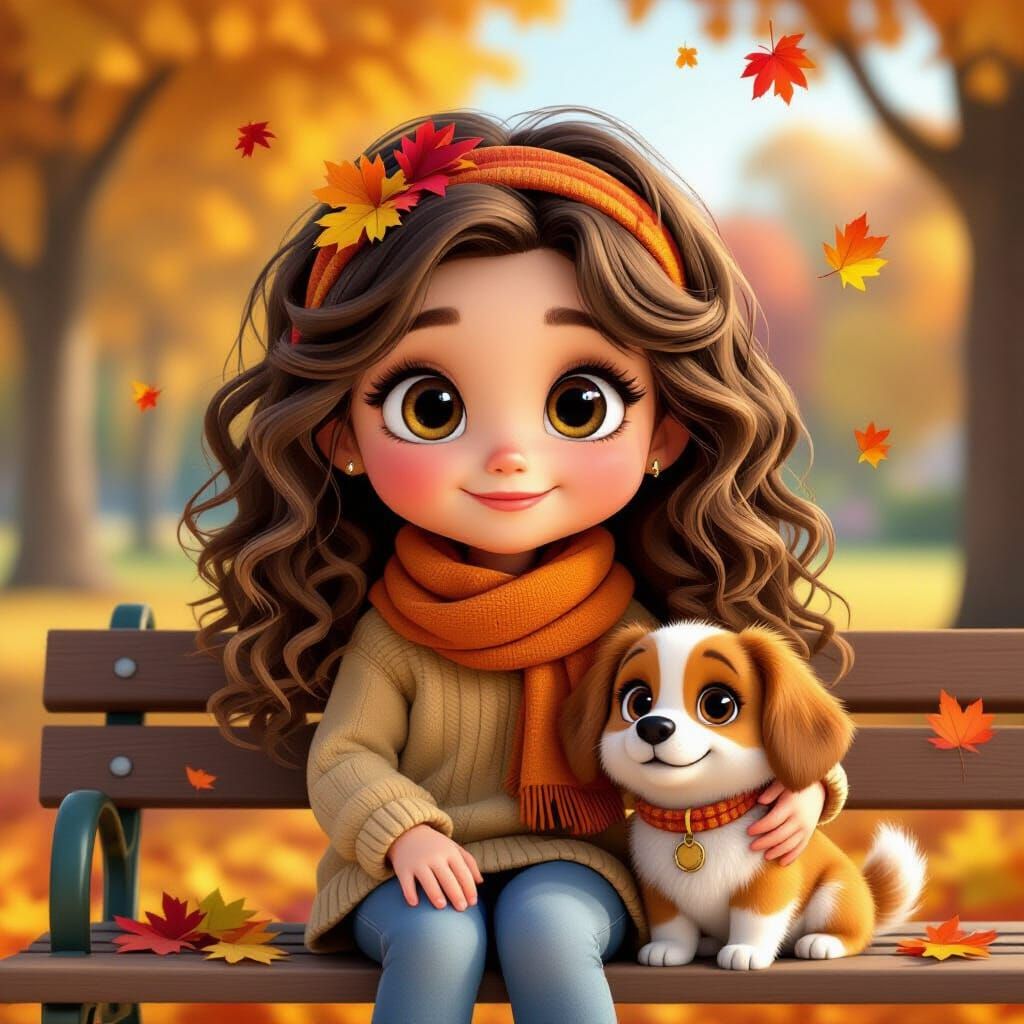 This 3D illustration shows a sweet girl in a cozy sweater and scarf, petting her dog on a park bench. Colorful leaves fall around them in a heartwarming, Pixar-inspired scene.