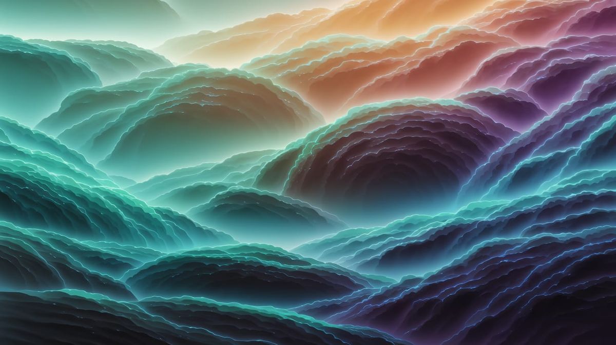 Revised Prompt: An abstract design in vibrant shades of turquoise, seamlessly blending from cool to warm tones, creates a mesmerizing chiaroscuro effect. Intricate textures and rich hues form a mystical, ethereal landscape, reminiscent of solarpunk and biopunk aesthetics. Soft, misty tendrils weave through the composition, adding depth and intrigue, while the overall scene is bathed in a warm, inviting light.