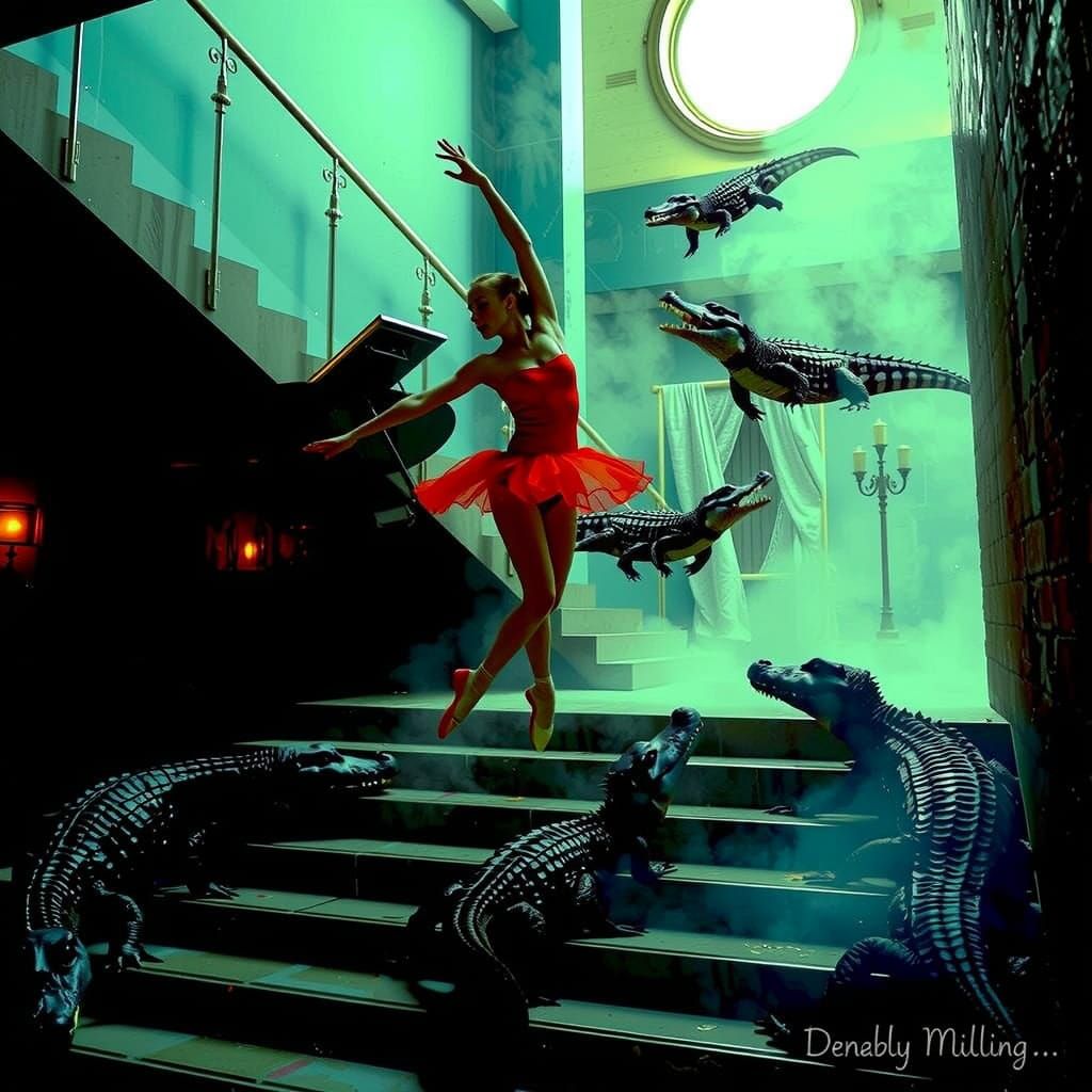 This image shows a ballerina in red ballet shoes dancing on a staircase near a grand piano, with a surreal hyperrealistic aesthetic.