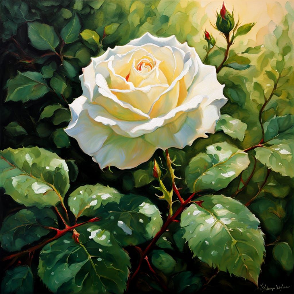 This image shows a white rose with a single drop of crimson blood on its petals, set against vibrant foliage. Rendered in an impressionist oil painting style with delicate detail and warm, golden hour light.